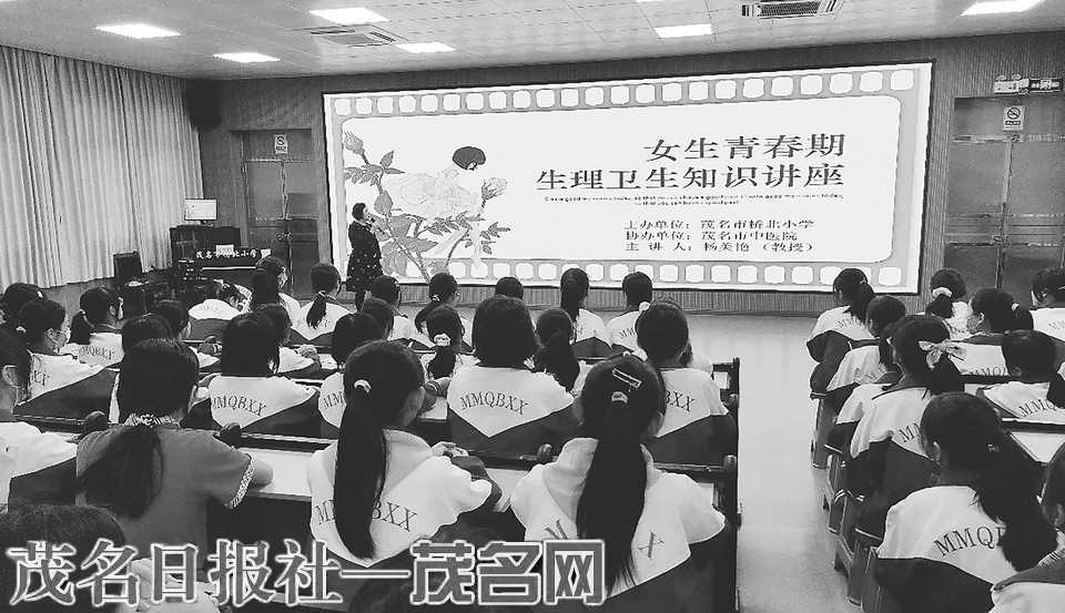 本报讯为了引导学生正确认识青春期生理及心理变化的特点,养成良好的青春期卫生习惯,消除成长中的困惑,增强自尊自爱及自我保护意识,近日,茂名市桥北小学邀请了茂名市中医院杨美艳教授为高年级女生作青春期健康知识讲座。