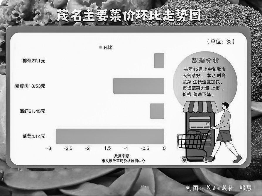 该中心负责人表示,去年12月份,我市蔬菜整体价格小幅回落。其中,12月上中旬我市天气晴好,本地时令蔬菜生长速度加快,市场蔬菜大量上市,价格普遍下降;12月中下旬我市受低温天气影响,部分蔬菜价格小幅上升。