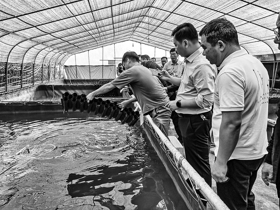 会前,陈夏森一行到低坑村众聚兴经济合作社百香果种植基地,实地查看百香果与生态鸡高效种养循环项目;随后前往赤坎村澳洲淡水小龙虾养殖基地,详细了解虾塘建设、育苗、产量、虾塘保温及市场价格等情况。