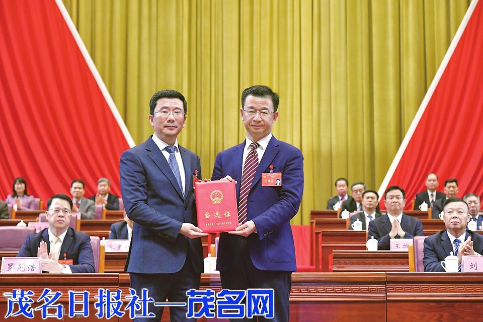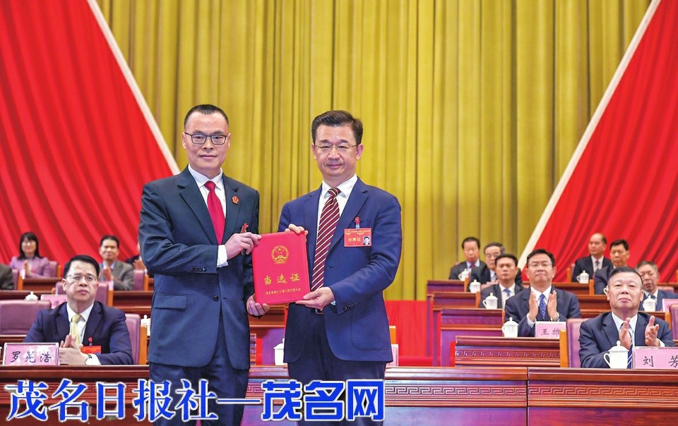 庄悦群向当选茂名市中级人民法院院长的龚德家颁发当选证书。