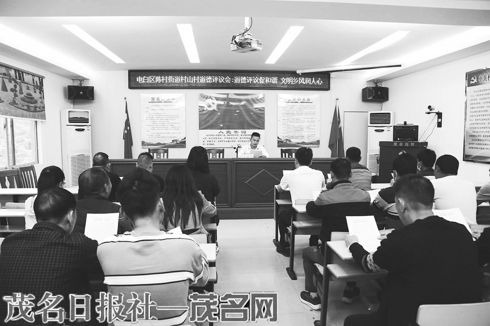村干部向村民讲解道德评议会的作用和意义。茂名日报社全媒体记者李颜东摄