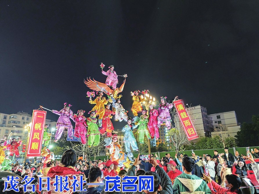 华灯初上,由信宜镇隆明珠飘色团带来的飘色巡游表演在众多市民的期待中隆重登场。《大展鸿图》《金龙腾飞》《仙鹤童子》《歌舞升平》……十个板式飘色,一板一个故事,形态各异、趣致可爱的“色仔”“色女”化身为民间传说或神话故事人物,手持鲜花、灯笼,脚踏白鸽、鲤鱼、金鱼等,凌空而起展现飘逸之感。浩浩荡荡的飘色巡游队伍如同泱泱巨龙,蜿蜒盘行在窦州墟内,气势恢宏、蔚为壮观,所到之处人山人海,锣鼓喧天,现场欢呼声一浪高过一浪,围观市民不断拍手称绝。