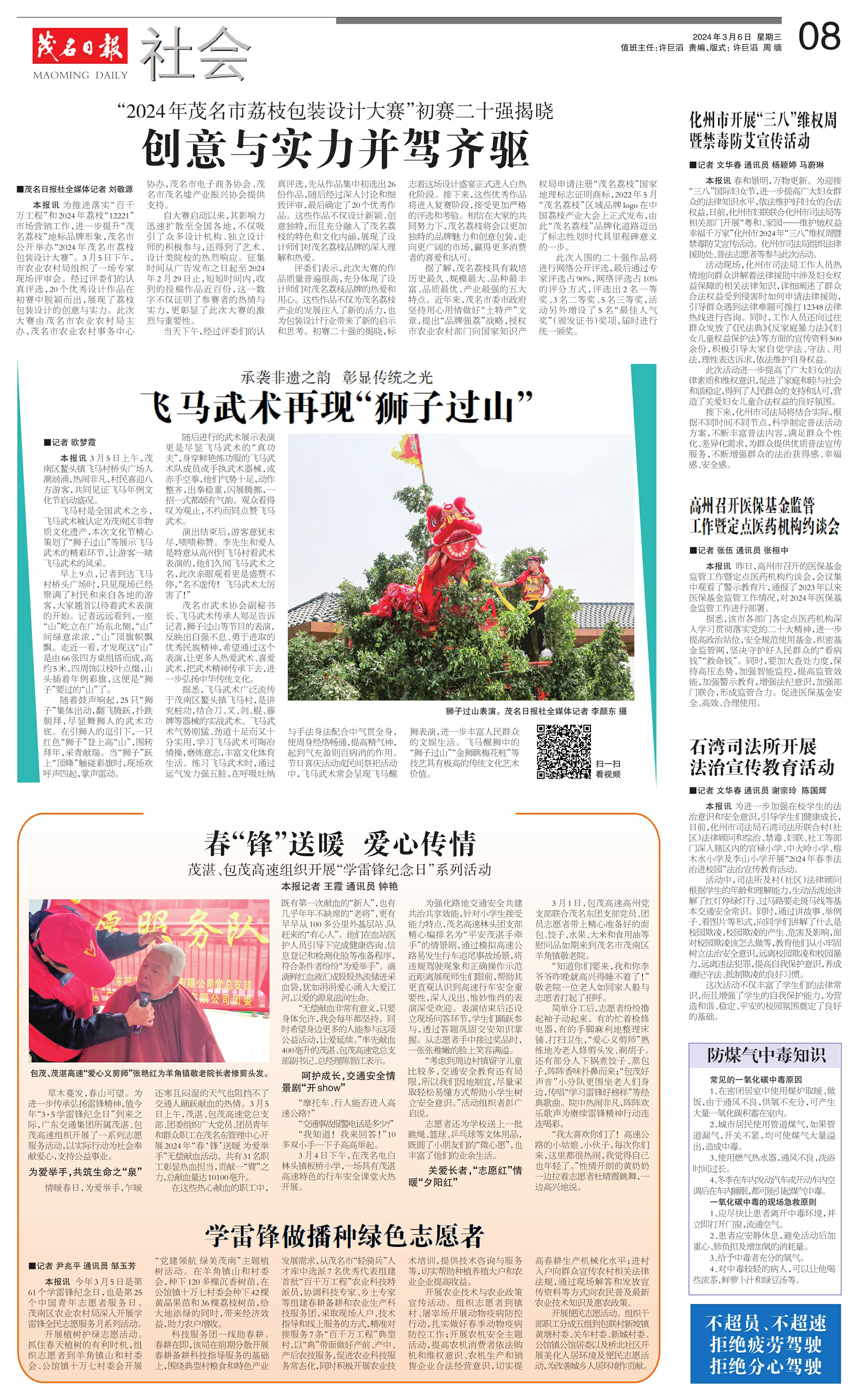 茂名市武术协会副秘书长、飞马武术传承人郑足告诉记者,狮子过山等节目的表演,反映出自强不息、勇于进取的优秀民族精神,希望通过这个表演,让更多人热爱武术、喜爱武术,把武术精神传承下去,进一步弘扬中华传统文化。