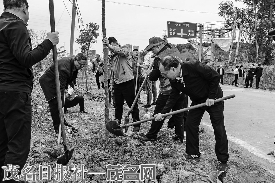 从3月7日至13日,在局领导的带领下,该局领导班子6名成员分别同所在的机关党支部党员们到化州市、高州市、信宜市、茂南区、电白区、滨海新区等6个公路绿化种植点参加植树。在植树活动现场,领导和党员们热情高涨,三五人一组,分工明确、齐心协力,有的挥锹铲土挖坑,有的扶正树苗,有的培土围堰,有的提水浇灌,各个环节衔接有序,相互配合默契十足,每道工序一丝不苟,现场到处充满了欢声笑语,一片热火朝天的忙碌景象(见左图)。