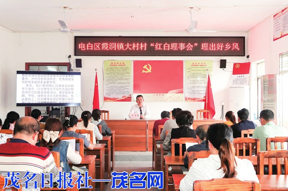 本报讯“近年来,一些农村的红白喜事规模越来越大,不仅浪费了资源,还增加了村民的负担……”走入电白区霞洞镇大村村党群服务中心,便看到党总支部书记、村委会主任王文魁正在开展“红白理事会 理出好乡风”的主题宣讲(如右图,茂名日报社全媒体记者吴云杰摄),数十名村民正聚精会神地听讲。