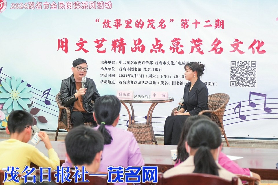 本报讯3月23日,由中共茂名市委宣传部、茂名市文化广电旅游体育局主办,茂名市图书馆和茂名日报社承办的文化栏目“故事里的茂名”第十二期:用文艺精品点亮茂名文化精彩开讲,广东省鲁迅文艺奖获得者薛永嘉与现场观众一起分享精彩的音乐故事和创作心得(如图,茂名日报社全媒体记者梁天摄)。活动通过新华社现场云直播,线上线下超过6万人次聆听了访谈。