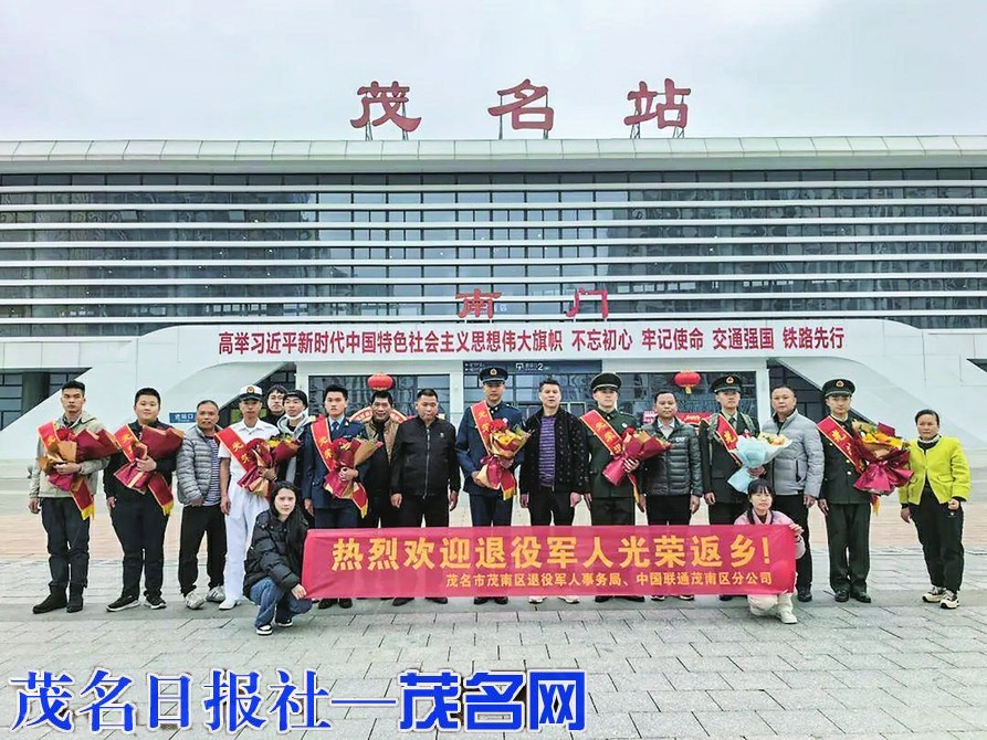在茂名站,茂南区退役军人事务局与茂南区联通公司的代表们早早地等候在此,迎接英雄们的归来。他们手持横幅,脸上洋溢着自豪与喜悦。当退役士兵们走出车站,立刻被家乡人民的热情掌声和欢呼声所包围。工作人员为每位退役士兵献上鲜花、披上光荣的绶带,送上最真挚的问候,确保他们在这春意盎然的时刻,能够深切感受到家的温暖与拥抱。