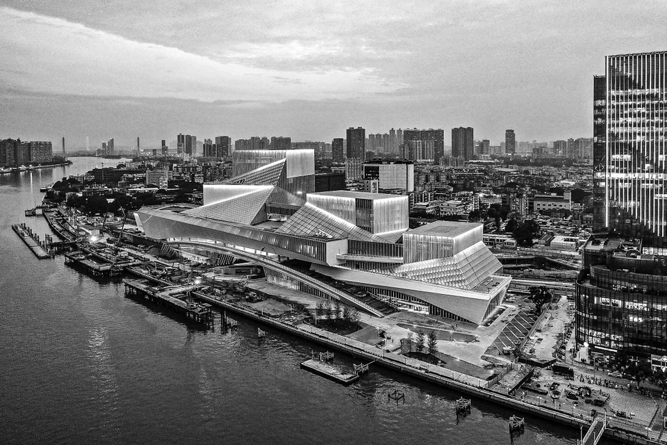 ▲由中建三局承建的白鹅潭大湾区艺术中心进行亮灯测试(1月31日摄,无人机照片)。新华社记者刘大伟摄