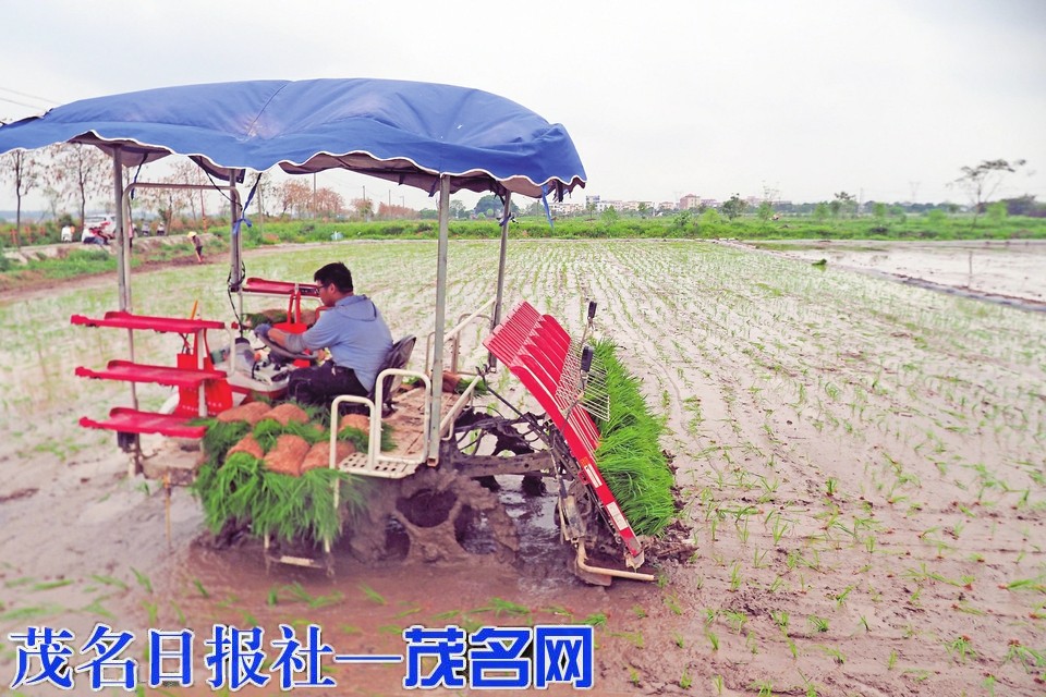 本报讯 4月6日,在茂南区金塘镇牙象村的一片农田里,插秧机来回穿梭,农技人员也在现场进行技术指导,伴随着插秧机的隆隆声,一株株秧苗整齐划一地种进了田里(如图黄林明摄)。
