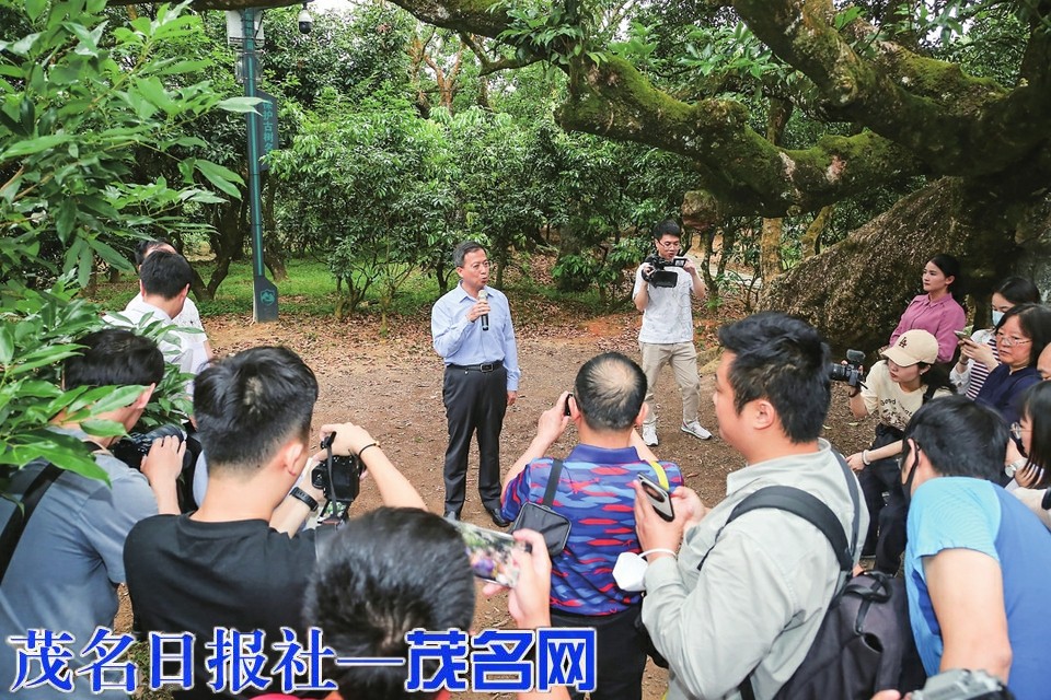 茂名市林业局局长向采访团介绍古荔枝树保护措施及成效。