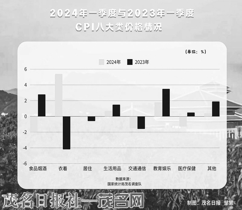 同比情况。一季度,茂名CPI同比与环比走势相同,呈现小倒“V”走势,1月CPI同比下降1.4%,2月上涨0.1%,3月度同比下降0.4%,涨跌交替出现。
