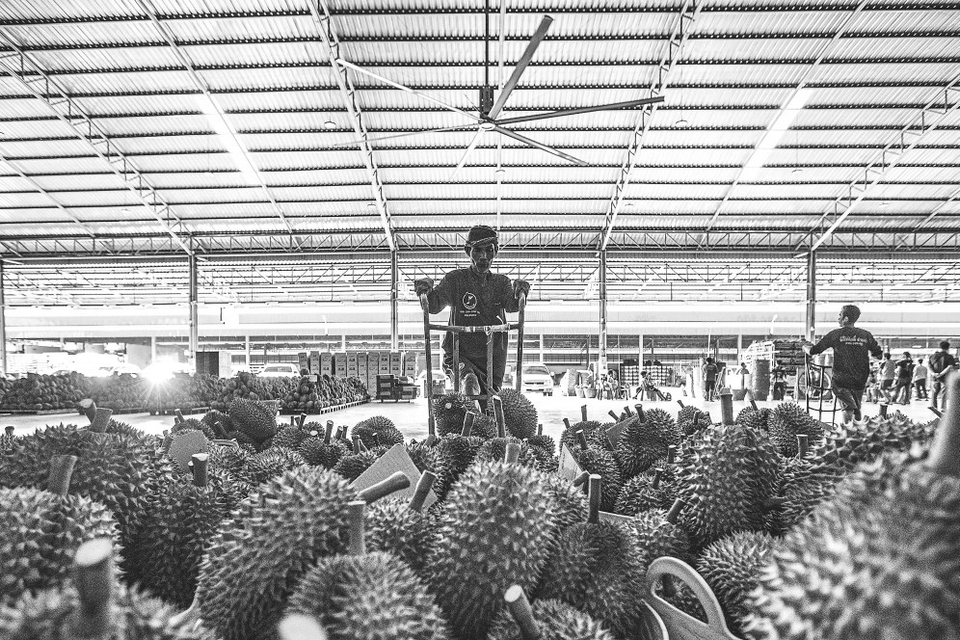 4月26日,在泰国尖竹汶府,工人在榴莲加工厂运输榴莲。
