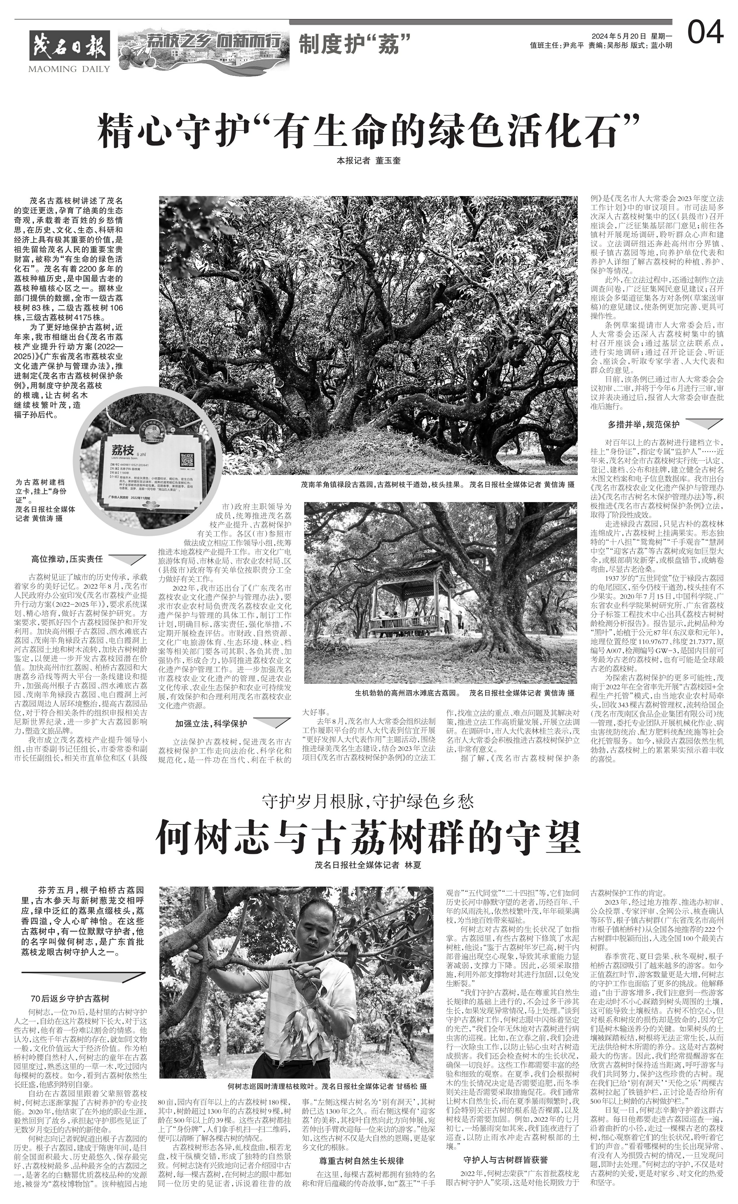 为了更好地保护古荔树,近年来,我市相继出台《茂名市荔枝产业提升行动方案(2022—2025)》《广东省茂名市荔枝农业文化遗产保护与管理办法》,推进制定《茂名市古荔枝树保护条例》,用制度守护茂名荔枝的根魂,让古树名木继续枝繁叶茂,造福子孙后代。