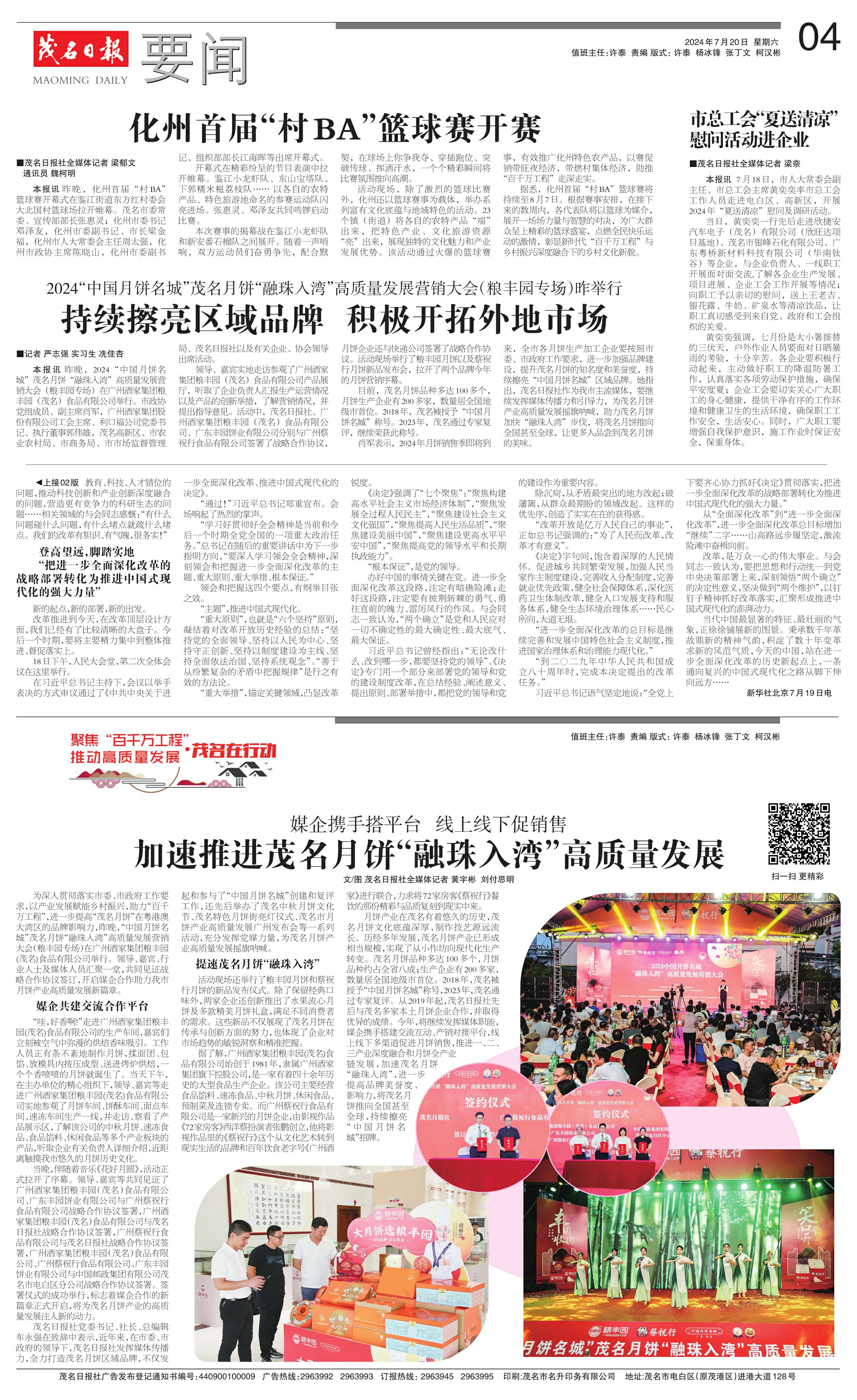月饼产业在茂名有着悠久的历史,茂名月饼文化底蕴深厚,制作技艺源远流长。历经多年发展,茂名月饼产业已形成相当规模,实现了从小作坊向现代化生产转变。茂名月饼品种多达100多个,月饼品种约占全省八成;生产企业有200多家,数量居全国地级市首位。2018年,茂名被授予“中国月饼名城”称号,2023年,茂名通过专家复评。从2019年起,茂名日报社先后与茂名多家本土月饼企业合作,并取得优异的成绩。今年,将继续发挥媒体职能,媒企携手搭建交流互动、产销对接平台,线上线下多渠道促进月饼销售,推进一、二、三产业深度融合和月饼全产业链发展,加速茂名月饼“融珠入湾”,进一步提高品牌美誉度、影响力,将茂名月饼推向全国甚至全球,持续擦亮“中国月饼名城”招牌。