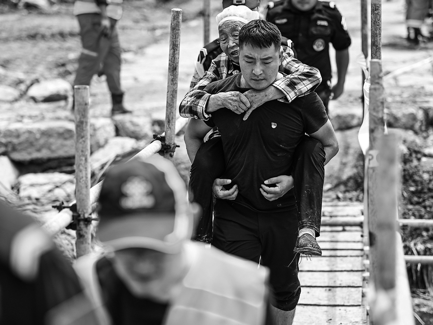 为了迅速转移群众,救援队伍在灾区搭起便桥,小伙子们还将行动不便的老人直接背在背上。