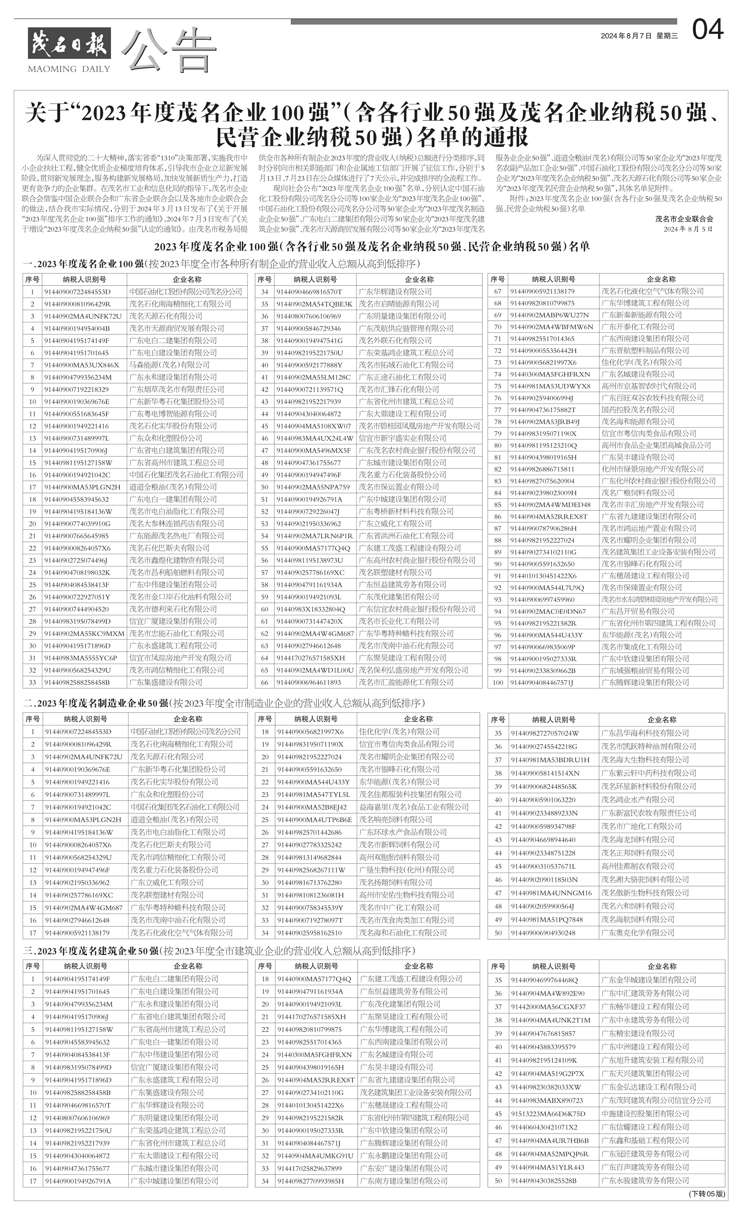 关于“2023年度茂名企业100强”(含各行业50强及茂名企业纳税50强、民营企业纳税50强)名单的通报