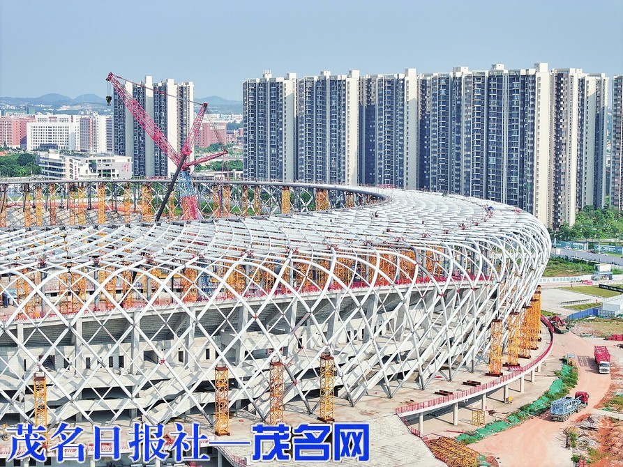 作为本届省运会主会场,茂名奥体中心体育场自开工以来便备受关注。8月19日上午,随着钢结构屋盖最后一块屋面网格缓缓升起,最终精准无误地落位,茂名奥体中心体育场项目钢结构屋盖全面合拢,巨型“荔枝”雏形显现。目前,该项目已经完成主体结构和钢结构施工,累计完成整体工程(进度)40%。接下来将进行拉索施工以及金属屋面幕墙和景观园林施工。