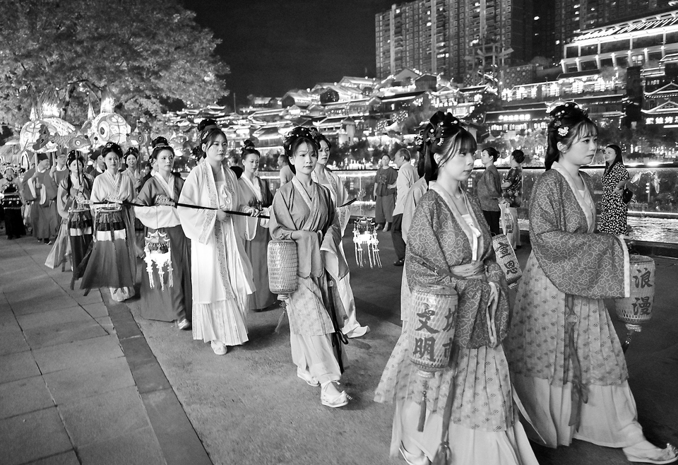 9月16日晚,在湖北省宣恩县城贡水河畔,人们身着传统服饰参加巡游活动。中秋假期,人们走出家门,乐享多彩假日。 新华社发(宋文摄)