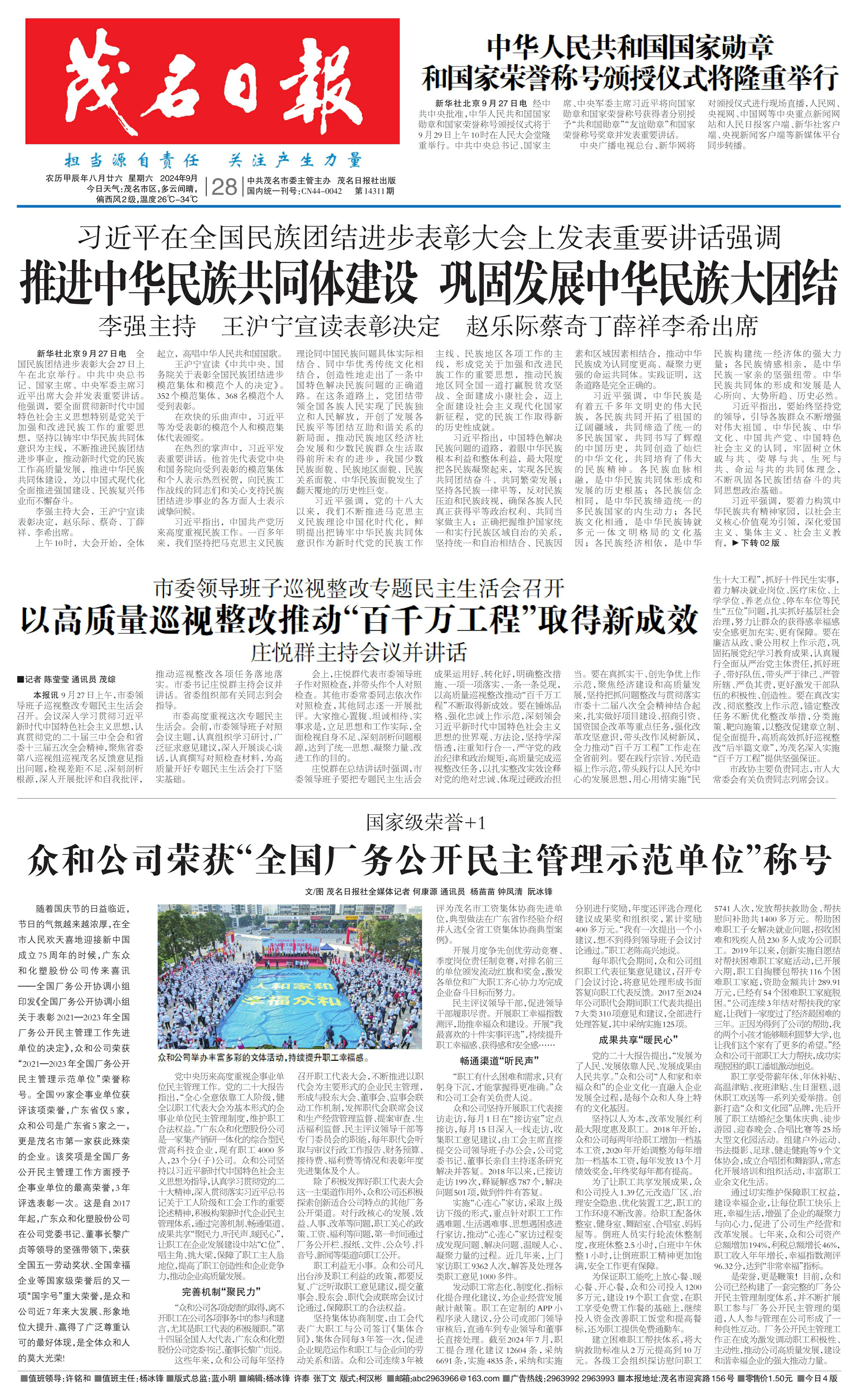 众和公司荣获“全国厂务公开民主管理示范单位”称号