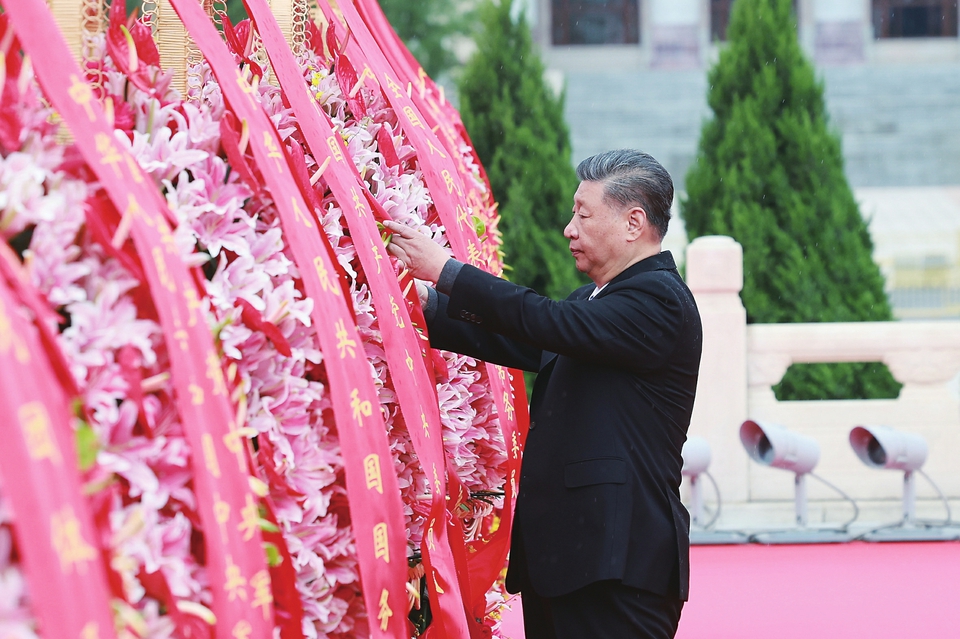 9月30日上午,党和国家领导人习近平、李强、赵乐际、王沪宁、蔡奇、丁薛祥、李希、韩正等来到北京天安门广场,出席烈士纪念日向人民英雄敬献花篮仪式。这是习近平整理花篮上的缎带。 新华社记者 王晔 摄