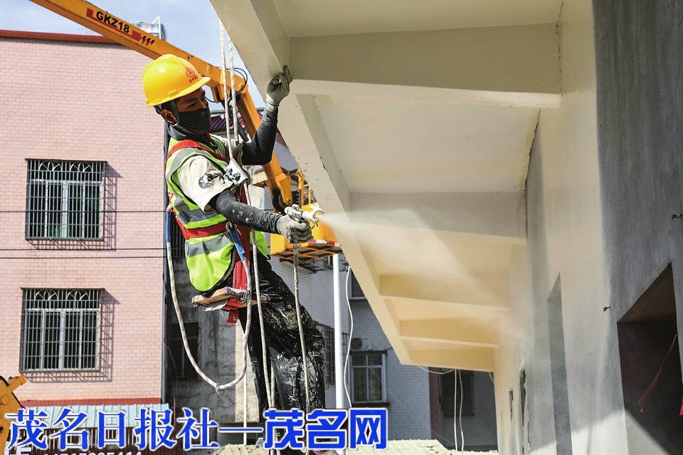 培训会采取了实地参观与集中交流相结合的形式,旨在通过直观的学习体验与深入的沟通交流,推动我市农房风貌提升工作的高效开展。与会人员首先前往高州市曹江镇荷垌村,实地参观了农房风貌提升施工现场,详细了解了新模式喷涂工艺的实际应用与操作流程(如图,通讯员 罗栋摄)。据介绍,高州市农房风貌提升一共有清理墙面、批抗裂砂浆二道、喷涂底漆和真石漆、喷罩面漆四个工序,工艺流程优化后,实现降本增效,花小钱办大事,以农房小变促乡村大变,全面提升镇村颜值。