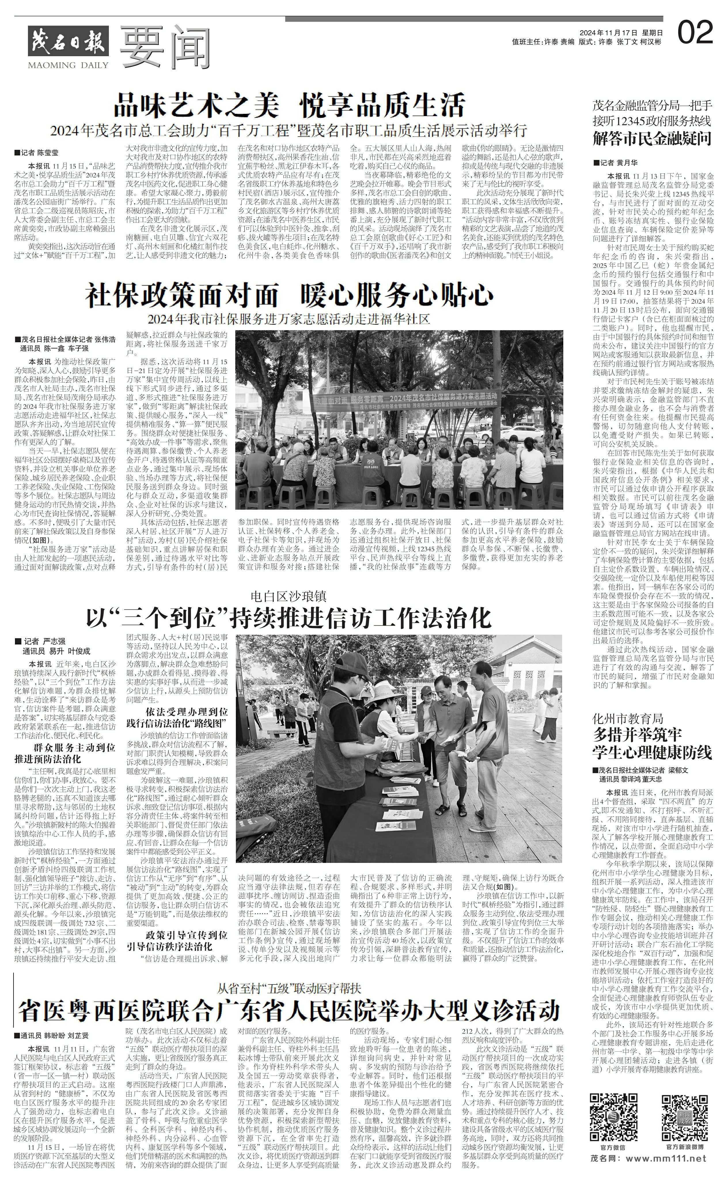 本报讯 11月15日,“品味艺术之美·悦享品质生活”2024年茂名市总工会助力“百千万工程”暨茂名市职工品质生活展示活动在潘茂名公园庙街广场举行。广东省总工会二级巡视员陈昭庆,市人大常委会副主任、市总工会主席黄奕奕,市政协副主席赖强出席活动。