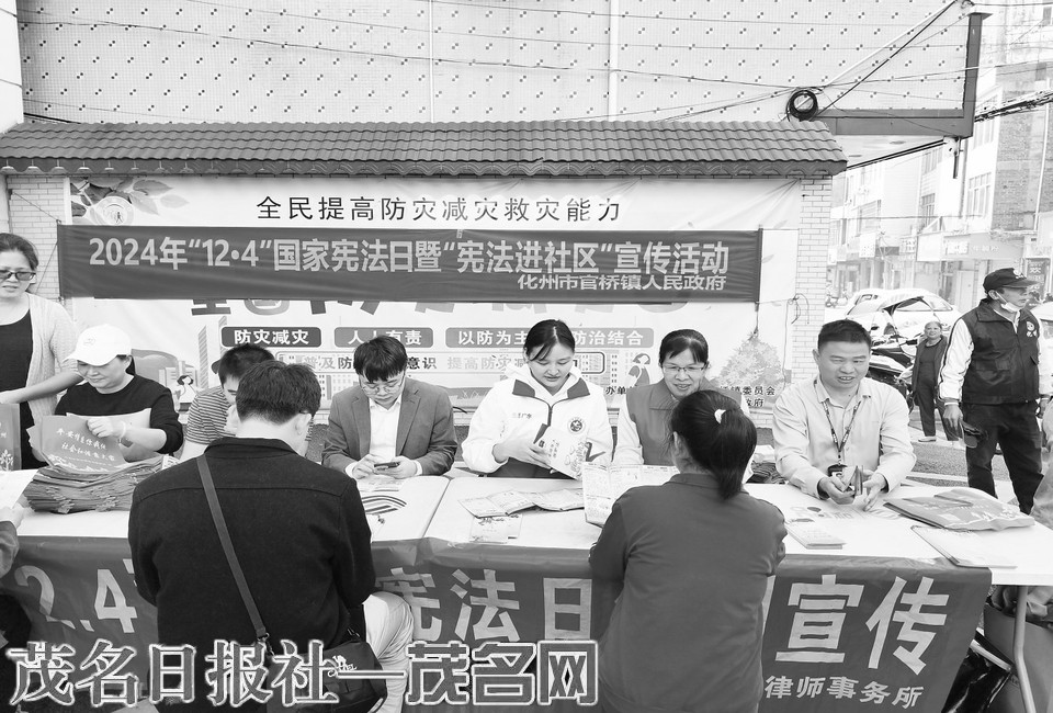 本报讯 12月4日是我国第十一个国家宪法日。当日,时值官桥镇群众赶集日,化州市官桥镇党委组织平安法治办、司法所、新时代文明实践所、妇联、禁毒协会等职能部门在镇政府门口“摆摊设点”,开展2024年“12·4”国家宪法日暨“宪法进社区”宣传活动,让宪法宣传接地气、聚人气、有活力(如图)。