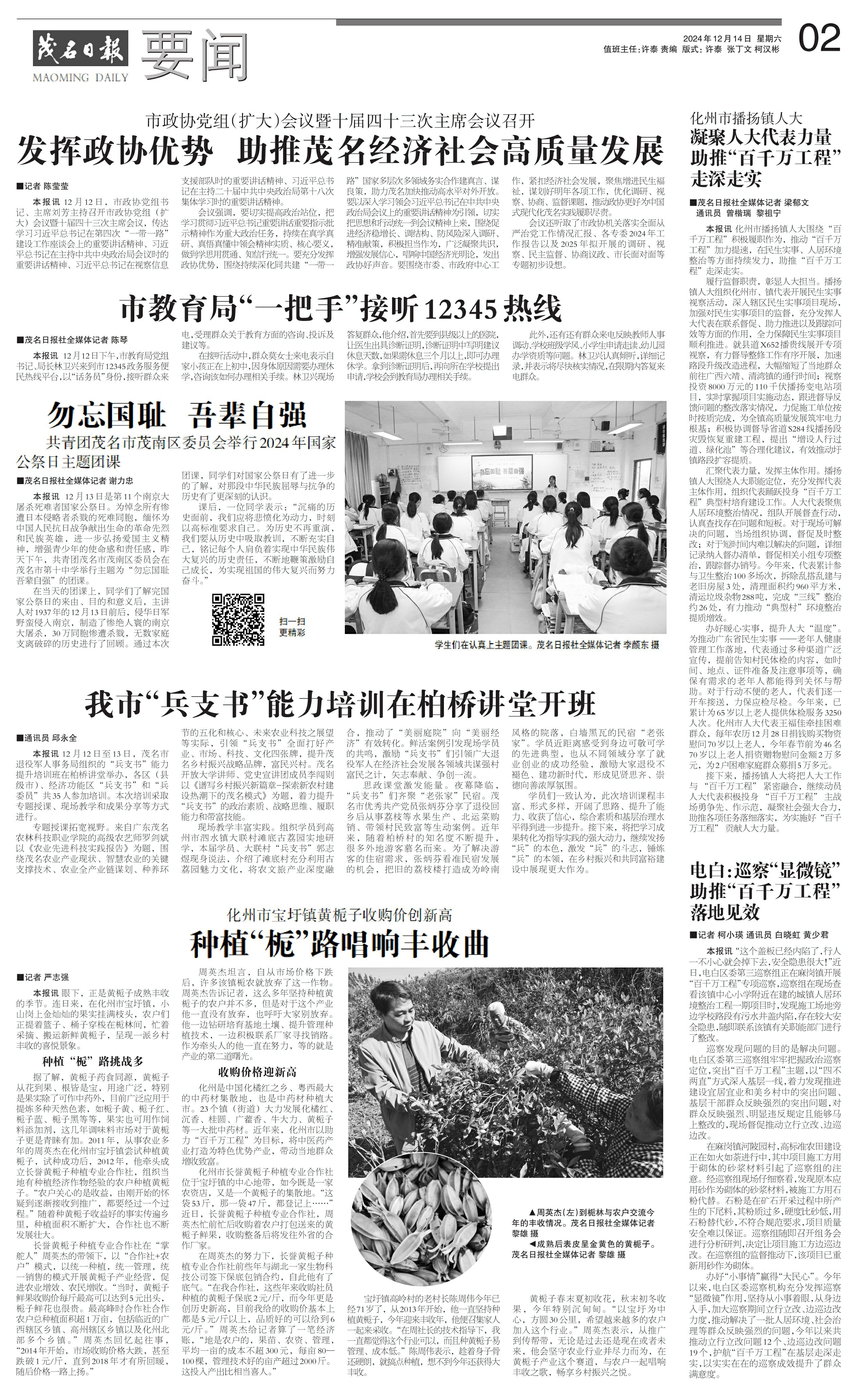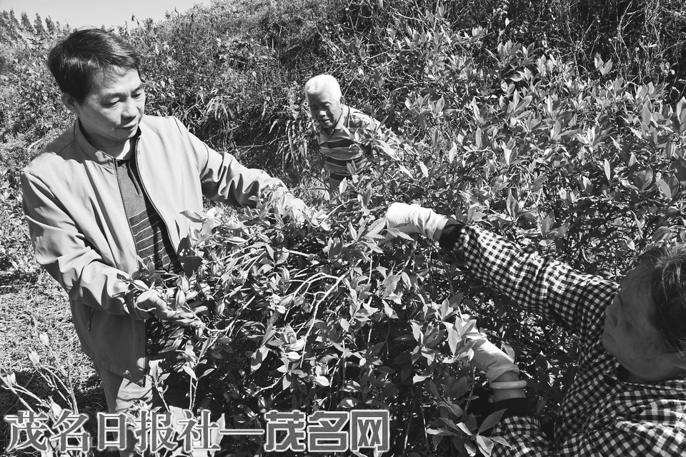 ▲周英杰(左)到栀林与农户交流今年的丰收情况。茂名日报社全媒体记者黎雄摄