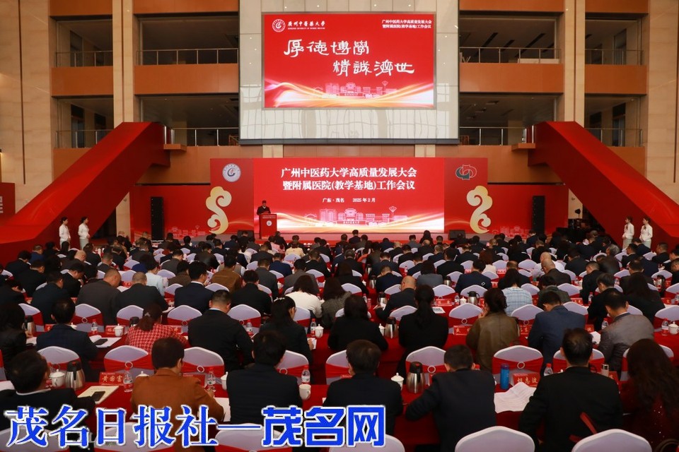 本报讯 岭南春潮涌,奋楫正当时。2月23日,广州中医药大学茂名医院(茂名市中医院)新院区迎来了一场意义非凡的中医药行业盛会——广州中医药大学高质量发展大会暨附属医院(教学基地)工作会议(如右图,李昊洋摄)。此次会议是广州中医药大学历史上首次把大会放到地级市召开,更是校政合作的全新里程碑,为茂名中医药事业高质量发展注入了强大动力。