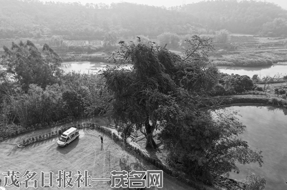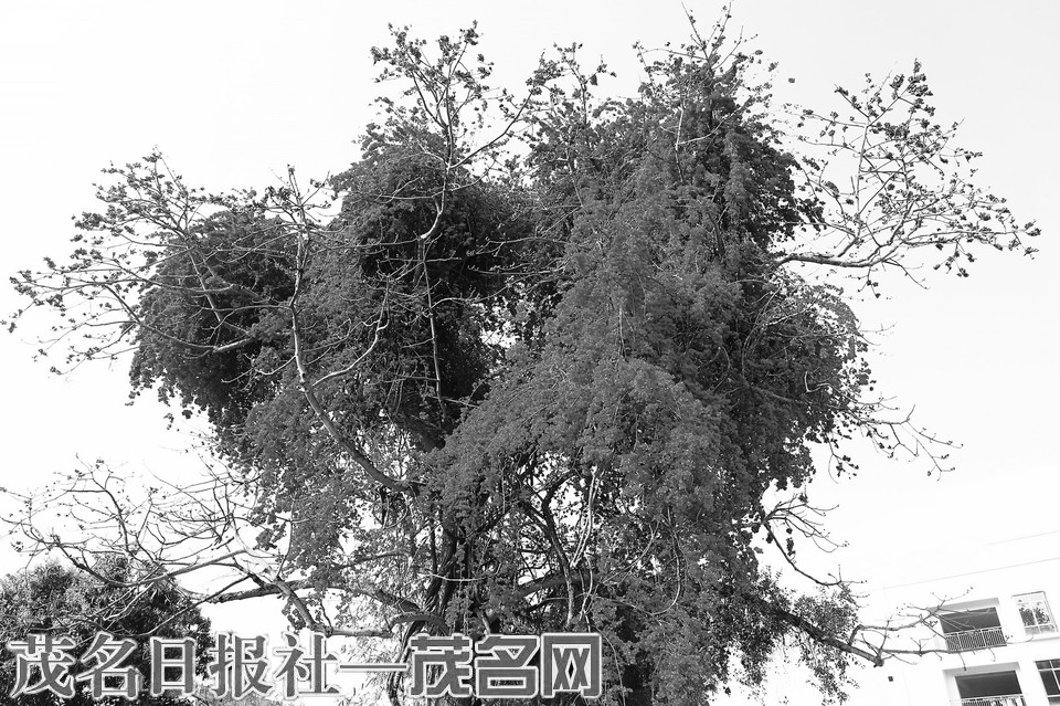 在信宜市镇隆卫生院内的空置地,有一株硕大的簕杜鹃依托一棵老木棉树生长。这株木棉树树形高大笔挺,花枝张开,花色殷红,而簕杜鹃柔软的枝条顺着木棉树粗壮的主干攀援而上,花色艳丽,姿态婀娜,二者花色相近,宛如一对身着情侣装且相拥在一起的“热恋情侣”。