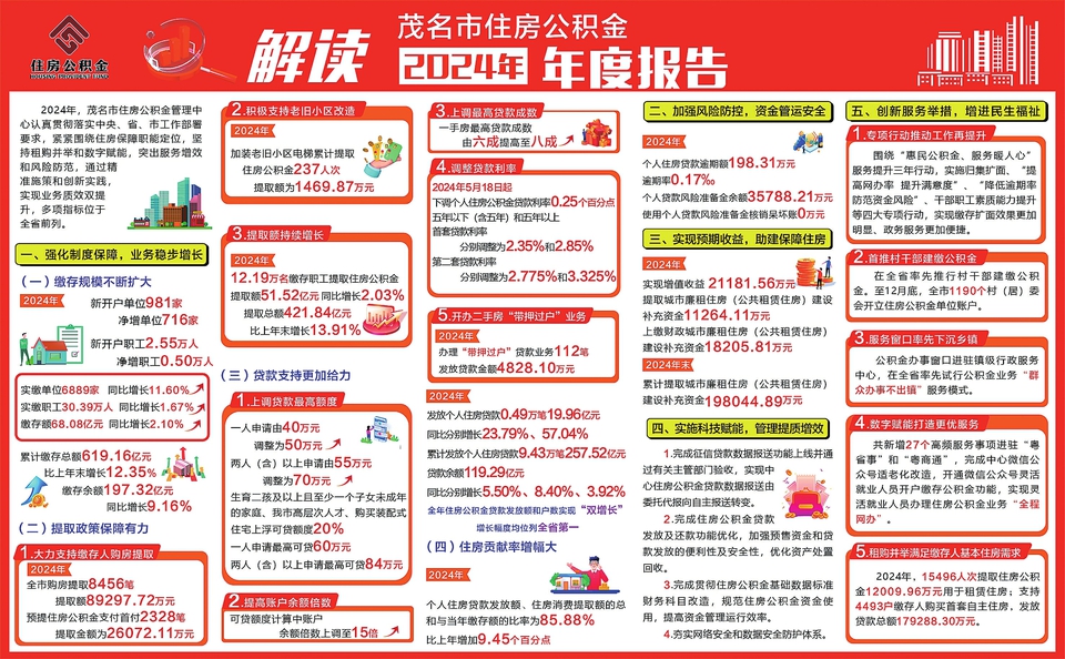 根据国务院《住房公积金管理条例》和住房和城乡建设部、财政部、人民银行《关于健全住房公积金信息披露制度的通知》(建金〔2015〕26号)的规定,茂名市住房公积金2024年年度报告经市住房公积金管理委员会审议通过,现公布如下: