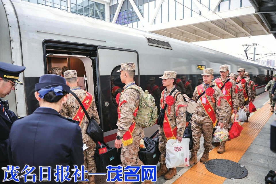 本报讯 3月16日上午,茂名市2025年上半年首批新兵起运,近百名身穿戎装、胸戴红花的新兵,带着亲人的嘱托与家乡人民的祝福,奔赴绿色军营,开启新的人生旅程(如右图,茂名日报社全媒体记者刘付思明摄)。市委常委、茂名军分区领导赵建明到场欢送新兵。