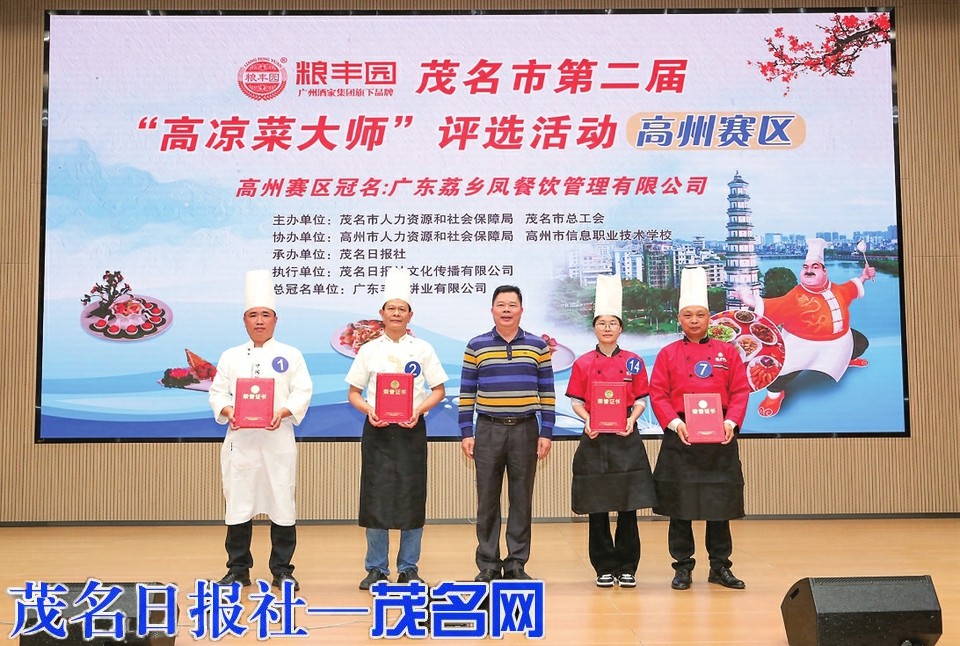 据悉,茂名市第二届“高凉菜大师”评选活动(高州赛区)由茂名市人力资源和社会保障局、茂名市总工会联合主办,高州市人力资源和社会保障局、高州市信息职业技术学校协办,茂名日报社承办,广东丰园饼业有限公司总冠 名 ; 同时,高州赛区还得到广东荔乡凤餐饮管理有限公司冠名与大力支持。