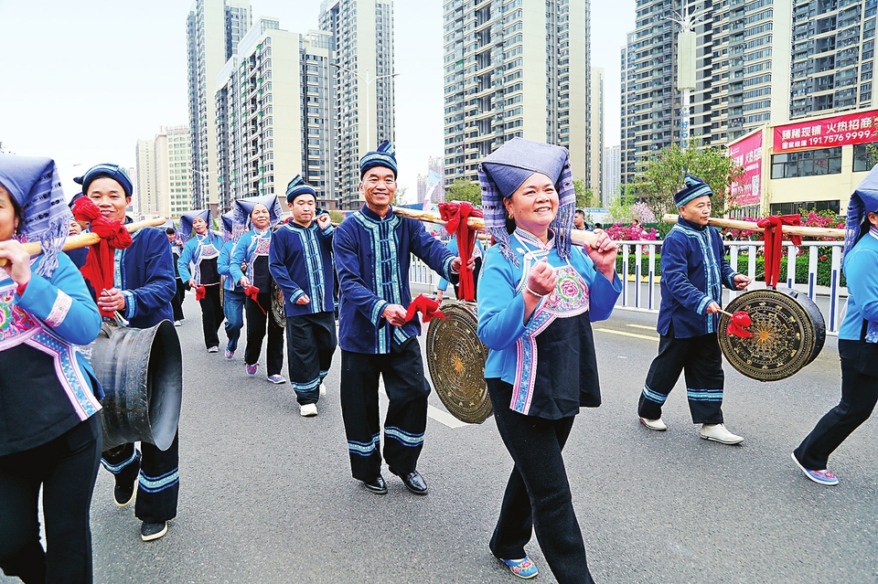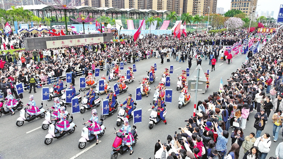 3月31日下午,贵港市区荷城路变身为流动的文化长廊:一群穿着壮族服饰的骑士骑着30辆“贵港造”电动铁骑帅气开道,抖音达人与壮族机甲并肩而行,18面巨型铜鼓与傩戏方阵的神秘舞步交织。这些方阵涵盖了传统民俗、现代科技、地方特色等多种元素,服装五彩斑斓,表演精彩纷呈,为观众带来了一场震撼的视听盛宴。
