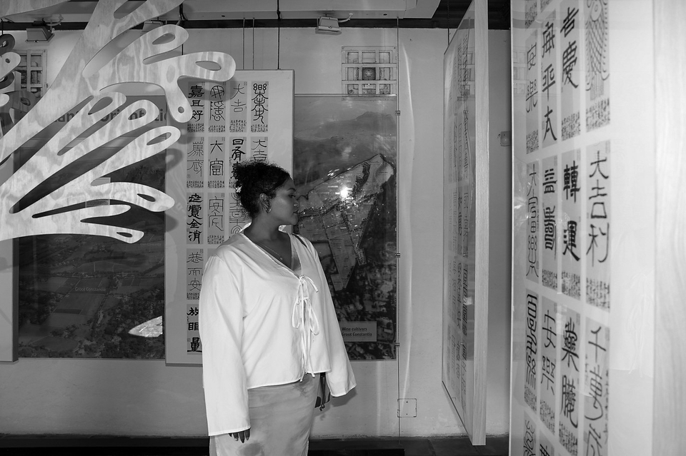 4月17日,在南非开普敦的伊齐科学习中心,一名女子在“国际中文日”庆祝活动上参观汉字艺术展。
