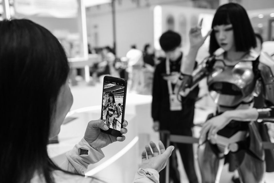 4月18日,观众在第五届消博会辽宁展台拍摄自己与机器人的互动过程。 4月18日,为期6天的第五届中国国际消费品博览会结束。本届消博会共有来自71个国家和地区的1767家企业、4209个消费品牌参展,规模创历届新高。本届消博会专业采购商超过6万人,相对于第四届增长超10%。新华社记者孙笑天摄