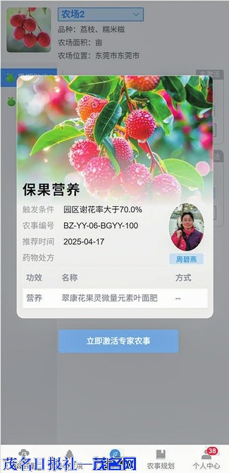 4月初,在高州市柏桥村,智慧农业系统检测出荔枝树区域谢花率达70%,便自动给出需要肥药的区域以及给出推荐肥药,形成处方地图。