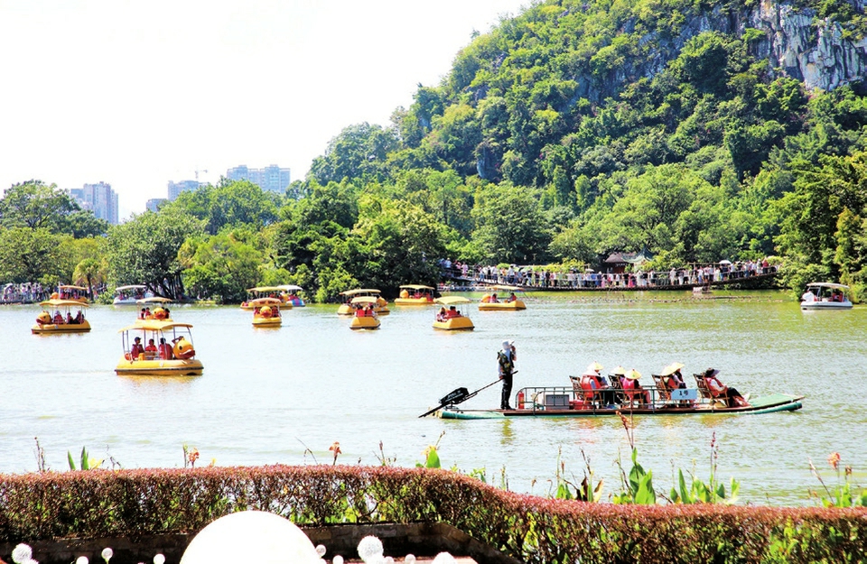 肇庆山清水秀,吸引五湖四海宾客。图为星岩景区里湖,游客乘船游玩。 西江日报记者 刘春林 摄
