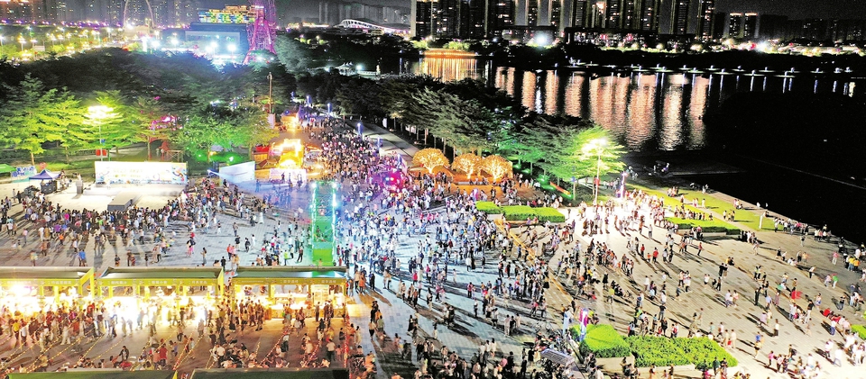 肇庆新区砚阳湖夜景,人山人海,热闹非凡。西江日报记者 刘春林 摄