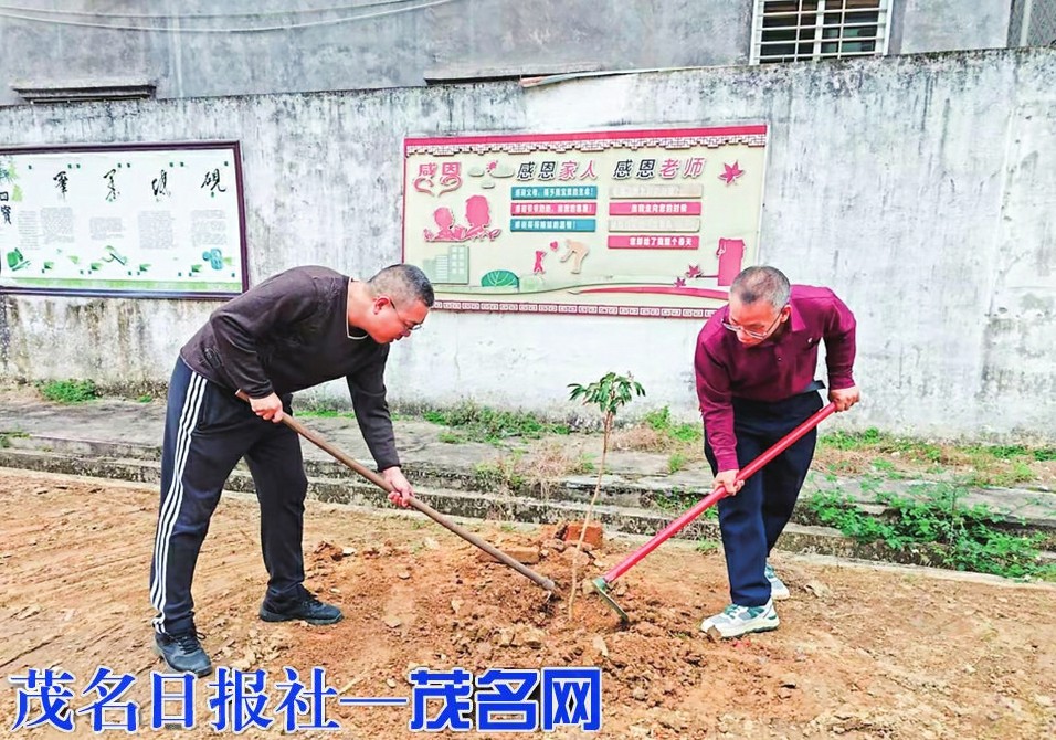 江炳伟(左)与同事一起在甘园小学种下仙进奉荔枝树苗。