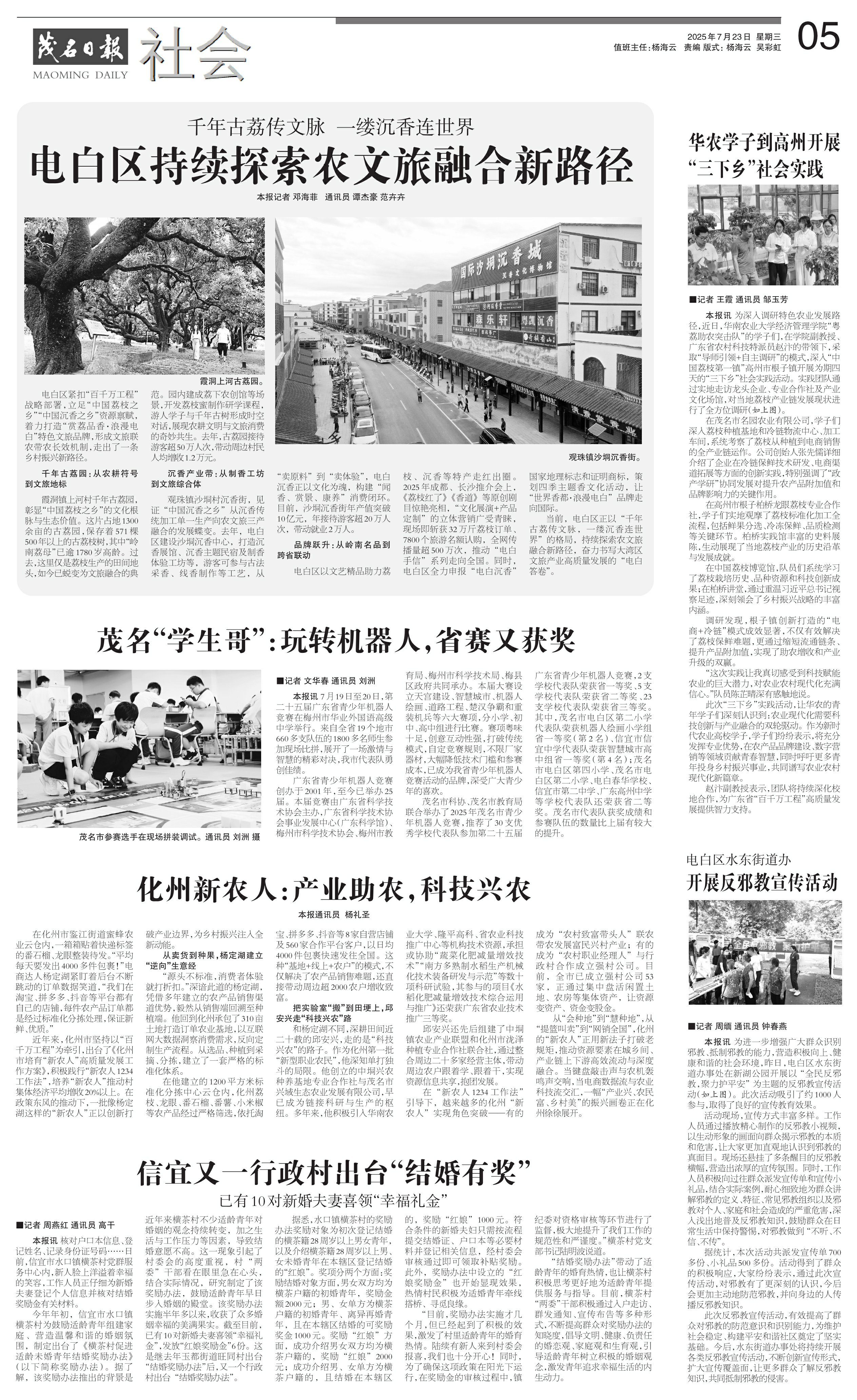 今年年初,信宜市水口镇横茶村为鼓励适龄青年组建家庭、营造温馨和谐的婚姻氛围,制定出台了《横茶村促进适龄未婚青年结婚奖励办法》(以下简称奖励办法)。据了解,该奖励办法推出的背景是近年来横茶村不少适龄青年对婚姻的观念持续转变,加之生活与工作压力等因素,导致结婚意愿不高。这一现象引起了村委会的高度重视,村“两委”干部看在眼里急在心头,结合实际情况,研究制定了该奖励办法,鼓励适龄青年早日步入婚姻的殿堂。该奖励办法实施半年多以来,收获了众多婚姻幸福的美满果实。截至目前,已有10对新婚夫妻喜领“幸福礼金”,发放“红娘奖励金”6份。这是继去年玉都街道旺同村出台“结婚奖励办法”后,又一个行政村出台“结婚奖励办法”。
