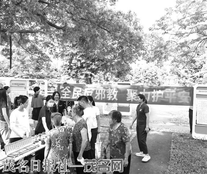 本报讯 为进一步增强广大群众识别邪教、抵制邪教的能力,营造积极向上、健康和谐的社会环境,昨日,电白区水东街道办事处在新湖公园开展以“全民反邪教,聚力护平安”为主题的反邪教宣传活动(如上图)。此次活动吸引了约1000人参与,取得了良好的宣传教育效果。