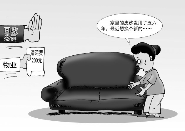 不少市民在更新家具家电时,都遭遇过“扔比买还难”的尴尬。“家里的皮沙发用了五六年,最近想换个新的,可没想到处理旧沙发比买新沙发还麻烦。”家住上海浦东的刘女士说,“回收公司不收这一款,联系物业说清运要收200元,想想还是算了。”(新闻来源:新闻晨报)