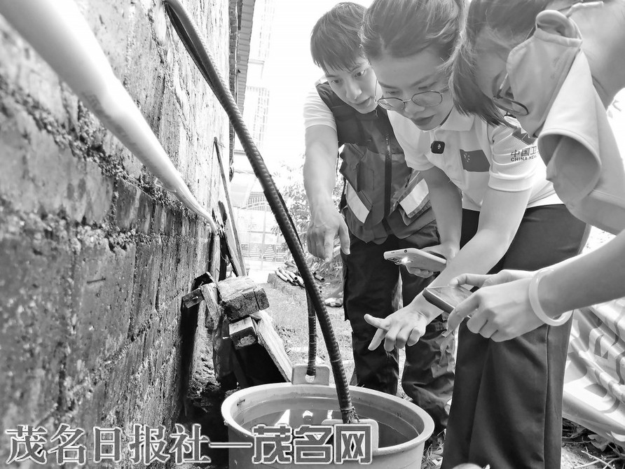 疾控人员在一处居民房外的积水处找到孑孓(蚊子幼虫)的踪迹。图/视频 茂名日报社全媒体记者岑稳