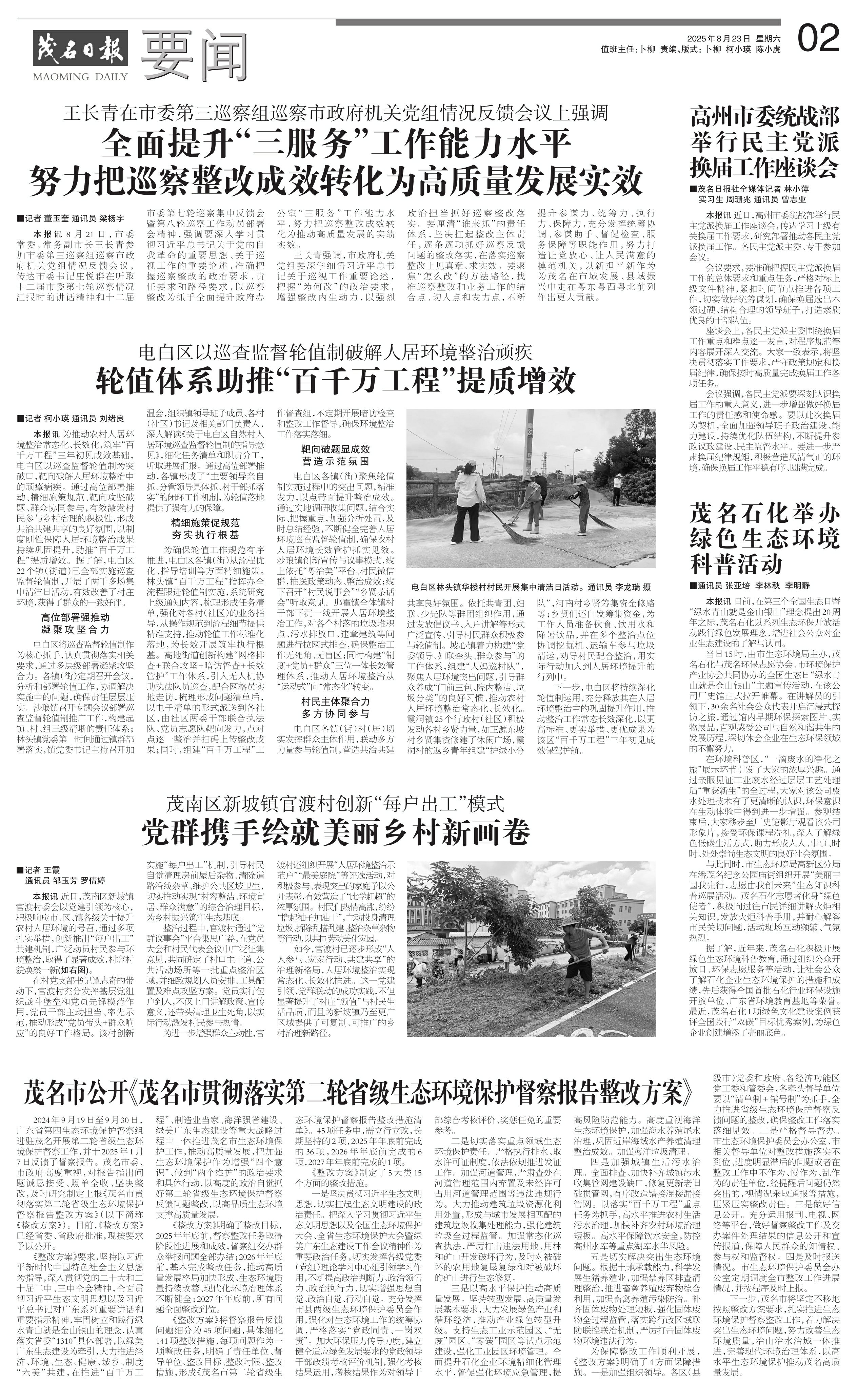 下一步,茂名市将坚定不移地按照整改方案要求,扎实推进生态环境保护督察整改工作,着力解决突出生态环境问题,努力改善生态环境质量,治山治水治城一体推进,完善现代环境治理体系,以高水平生态环境保护推动茂名高质量发展。