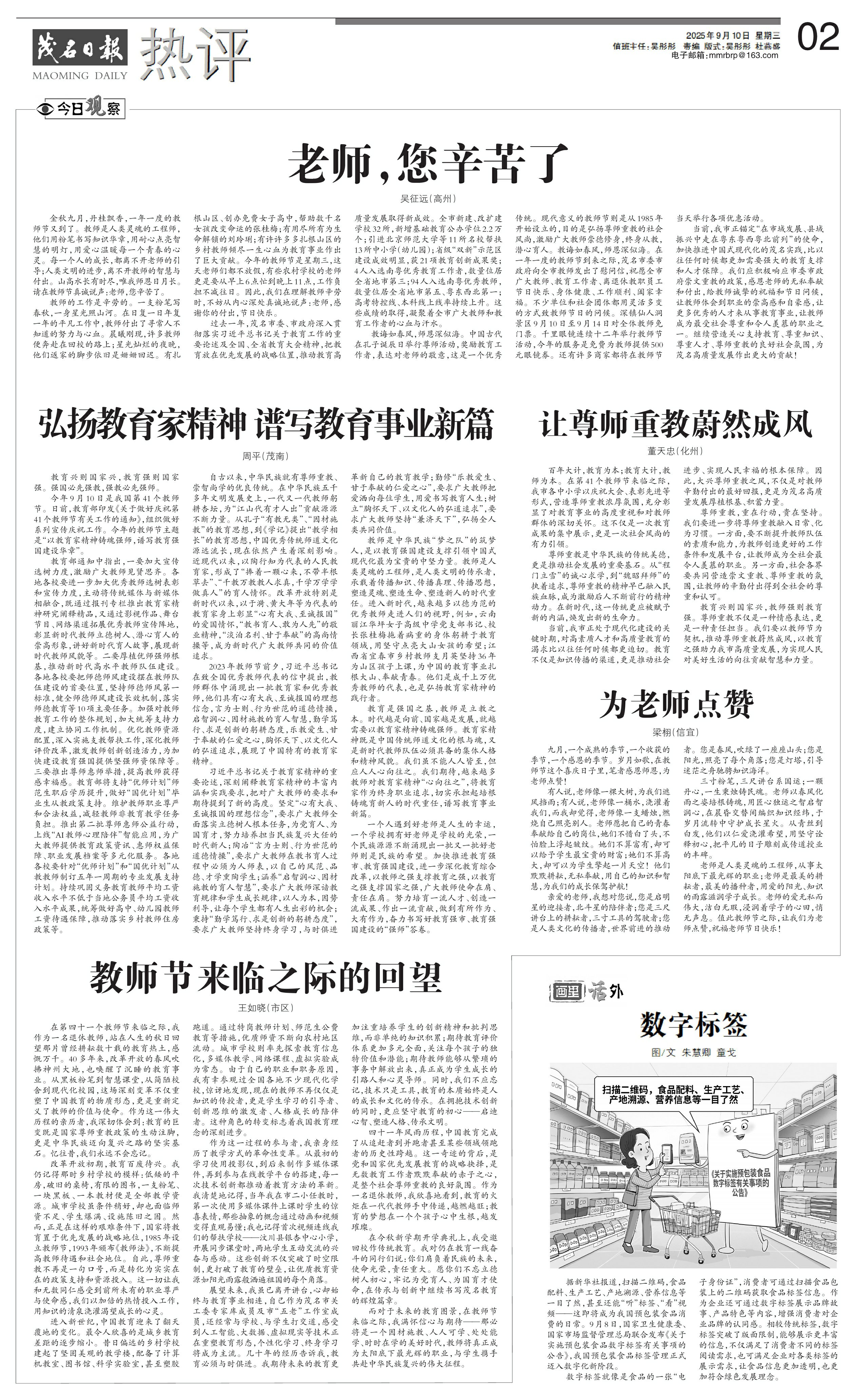 在今秋新学期开学典礼上,我受邀回校作传统教育。我对仍在教育一线奋斗的同行们说:你们肩负着民族的未来,使命光荣,责任重大。愿你们不忘立德树人初心,牢记为党育人、为国育才使命,在传承与创新中继续书写茂名教育的辉煌篇章。