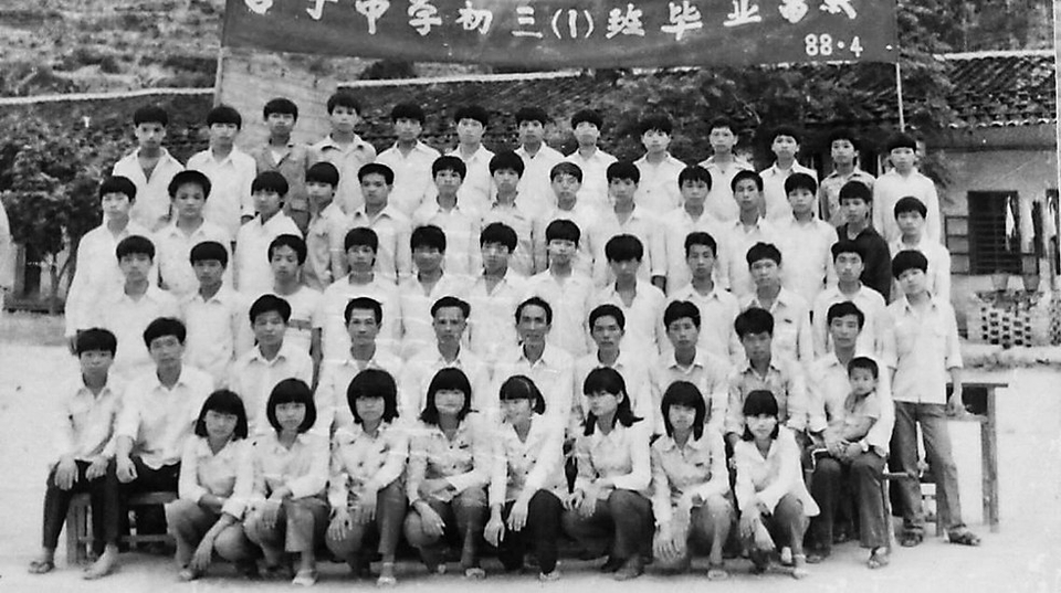 1985年秋,刚走出师范学校大门的他离开家乡,远赴高州东北部山区的古丁中学,开启了教书育人的人生旅程。冯老师虽然是初登教坛,但他的语文课上得绘声绘色,大家听得如痴如醉,如沐春风。课外,他还教大家唱歌,与大家一起跑步,种菜……校园内外留下了我们的欢声笑语。在古丁中学任教的3年时间里,冯老师把心把爱把情倾注在我们身上,是我们整个初中时代成长的一盏明灯。1988年,我们毕业前夕,冯老师(第二排左二)与我们合影,留下了珍贵的回忆。