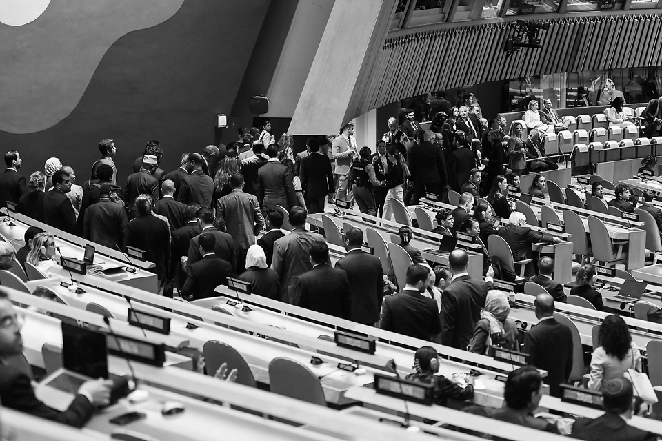9月26日,在位于纽约的联合国总部,众多代表退场抗议。新华社记者 李睿 摄