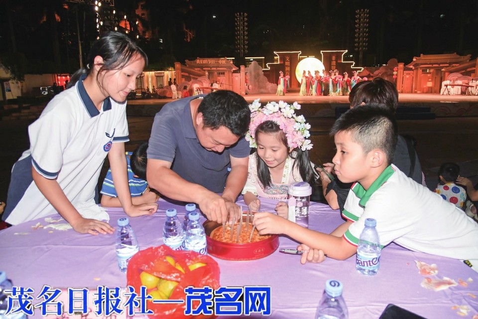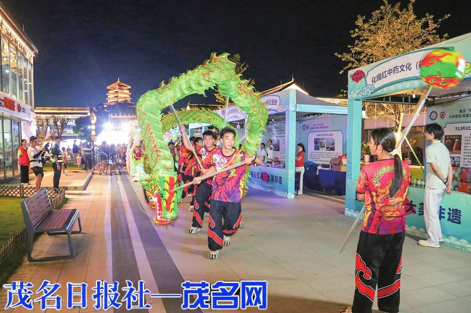 “有得吃有得玩有节目看,带孩子来感受一下气氛,活动真不错。”9月27日晚的庙街广场,李先生带着家人来参加社科普及(非遗文化)展演活动,现场有簸箕炊、花生糖、墨鱼饼、食惯嘴粉等19个非遗美食摊位,还有13个非遗文创产品展位,包括电白贝雕、电白沉香、茂南扎染等。在广场上还有非遗图文展,包括冼夫人文化和茂名特色非遗名录及核心内容。舞蹈《跳花棚》、歌舞《缘是荔枝来》、舞蹈《洪狮舞》等从国家级、省级非遗表演艺术全新创编而来的优秀节目,为在场市民带来一场兼具文化韵味和地方特色的文化盛宴。