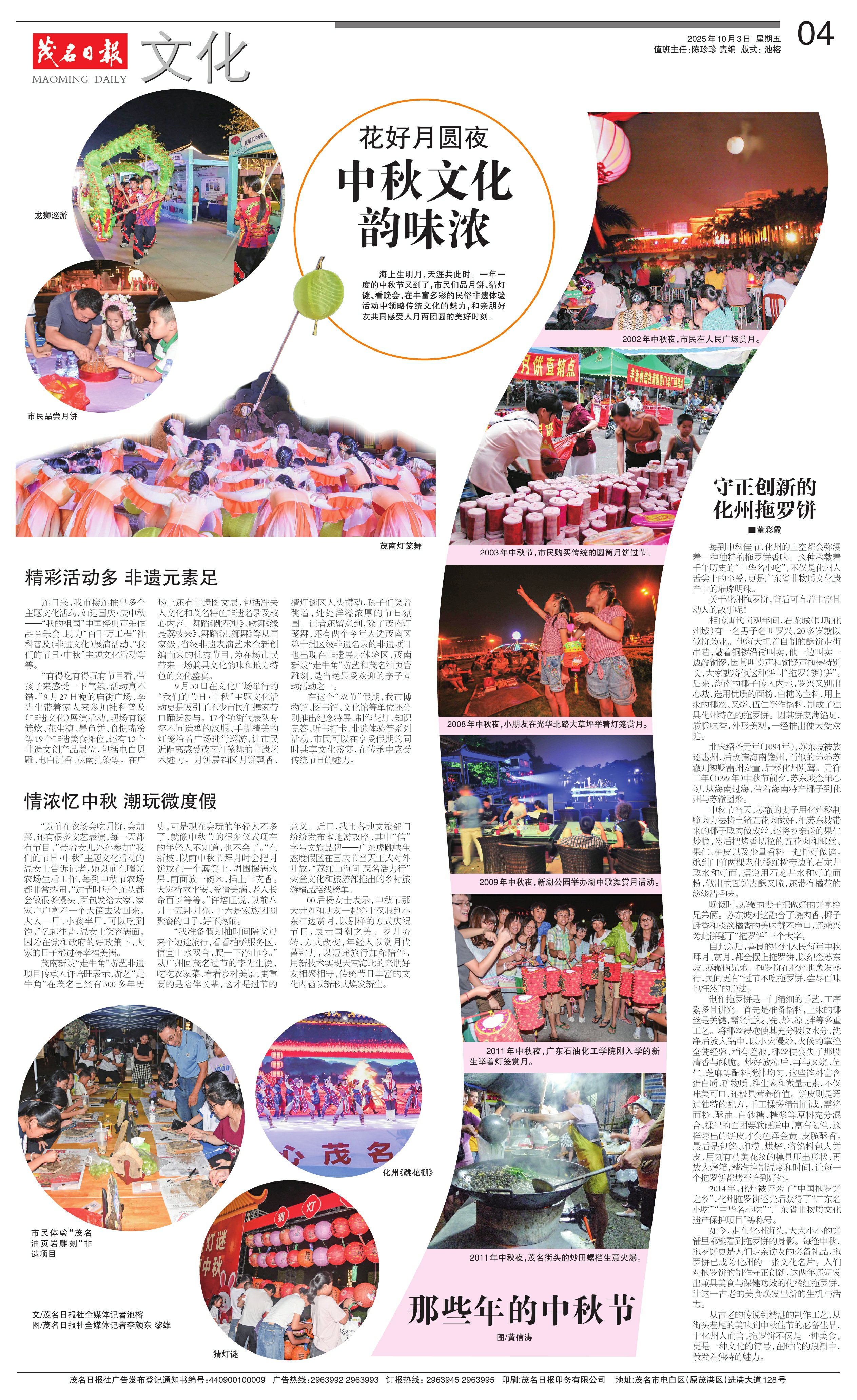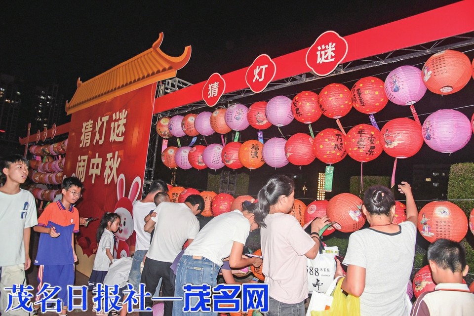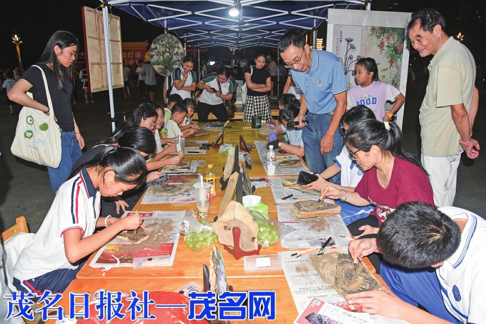 9月30日在文化广场举行的“我们的节日·中秋”主题文化活动更是吸引了不少市民们携家带口踊跃参与。17个镇街代表队身穿不同造型的汉服、手提精美的灯笼沿着广场进行巡游,让市民近距离感受茂南灯笼舞的非遗艺术魅力。月饼展销区月饼飘香,猜灯谜区人头攒动,孩子们笑着跳着,处处洋溢浓厚的节日氛围。记者还留意到,除了茂南灯笼舞,还有两个今年入选茂南区第十批区级非遗名录的非遗项目也出现在非遗展示体验区,茂南新坡“走牛角”游艺和茂名油页岩雕刻,是当晚最受欢迎的亲子互动活动之一。